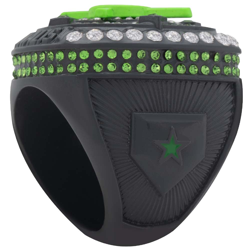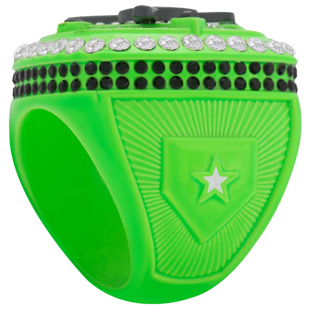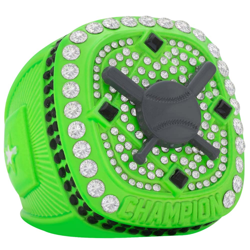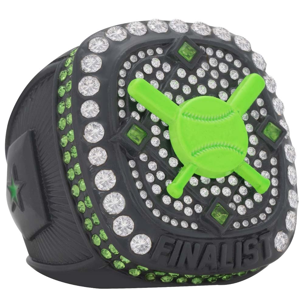 Cross-Bat Series rings are made with an edge to edge die cut molds along with hand placed stone embellishments. Available in a variety of colors to fit your event! Presented in a felt drawstring bag marked with the finger size on the back.