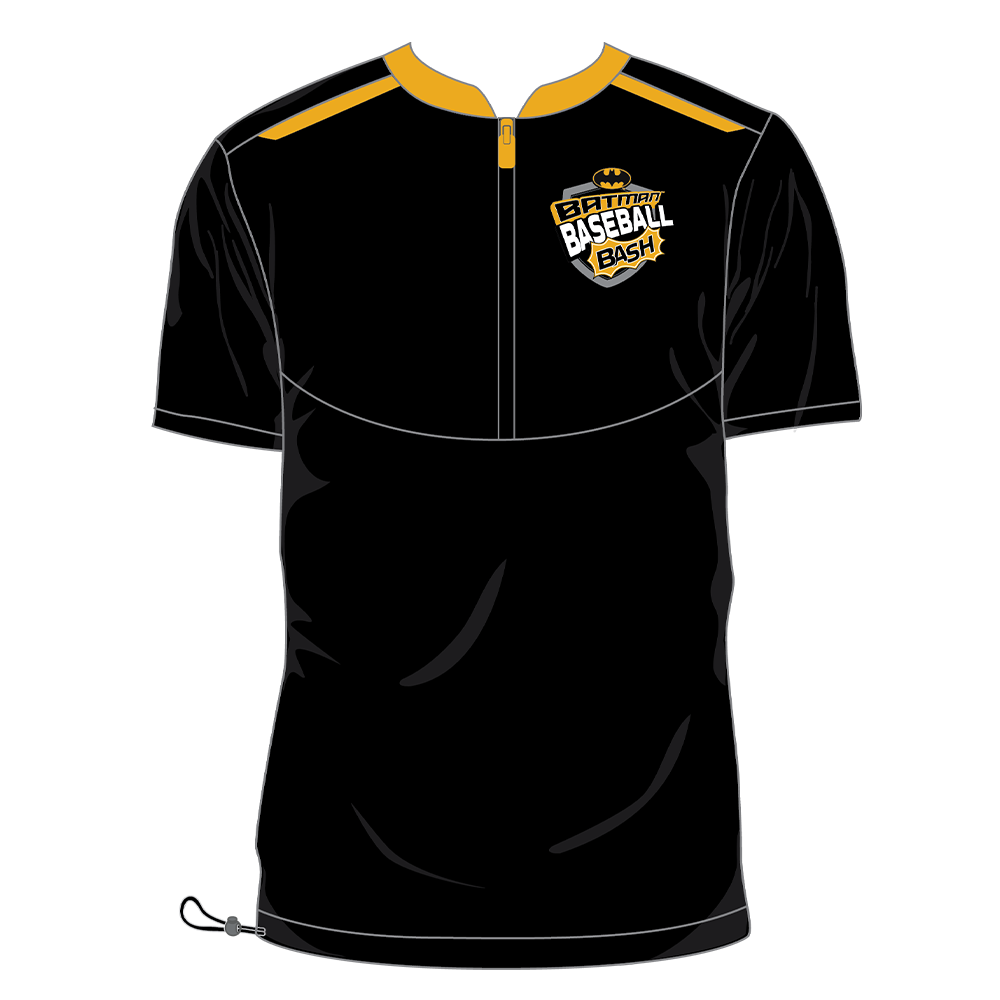 Windbreaker pullover jacket with with bottom pull string, front pockets and quarter zipper. Batman tournament logo on left chest. Lightweight and comfortable.