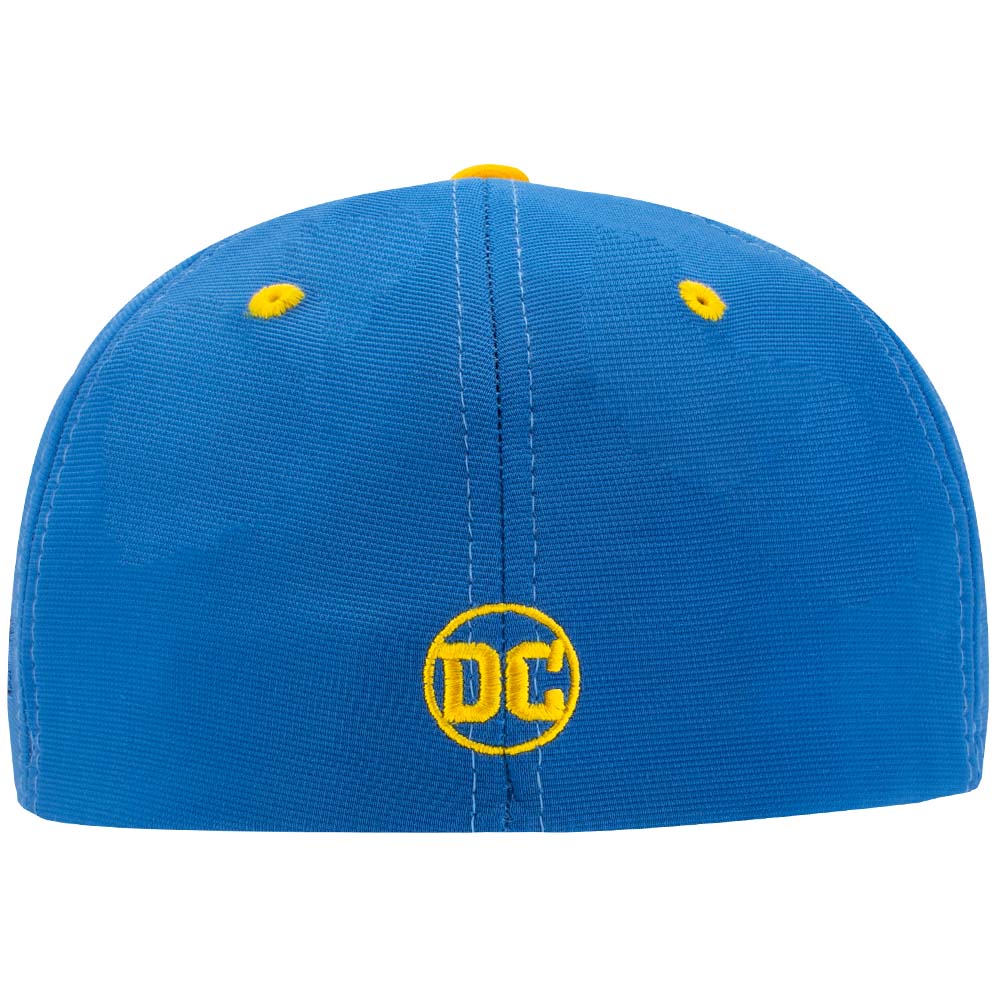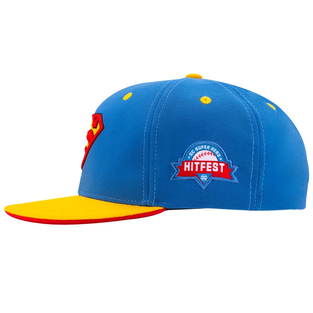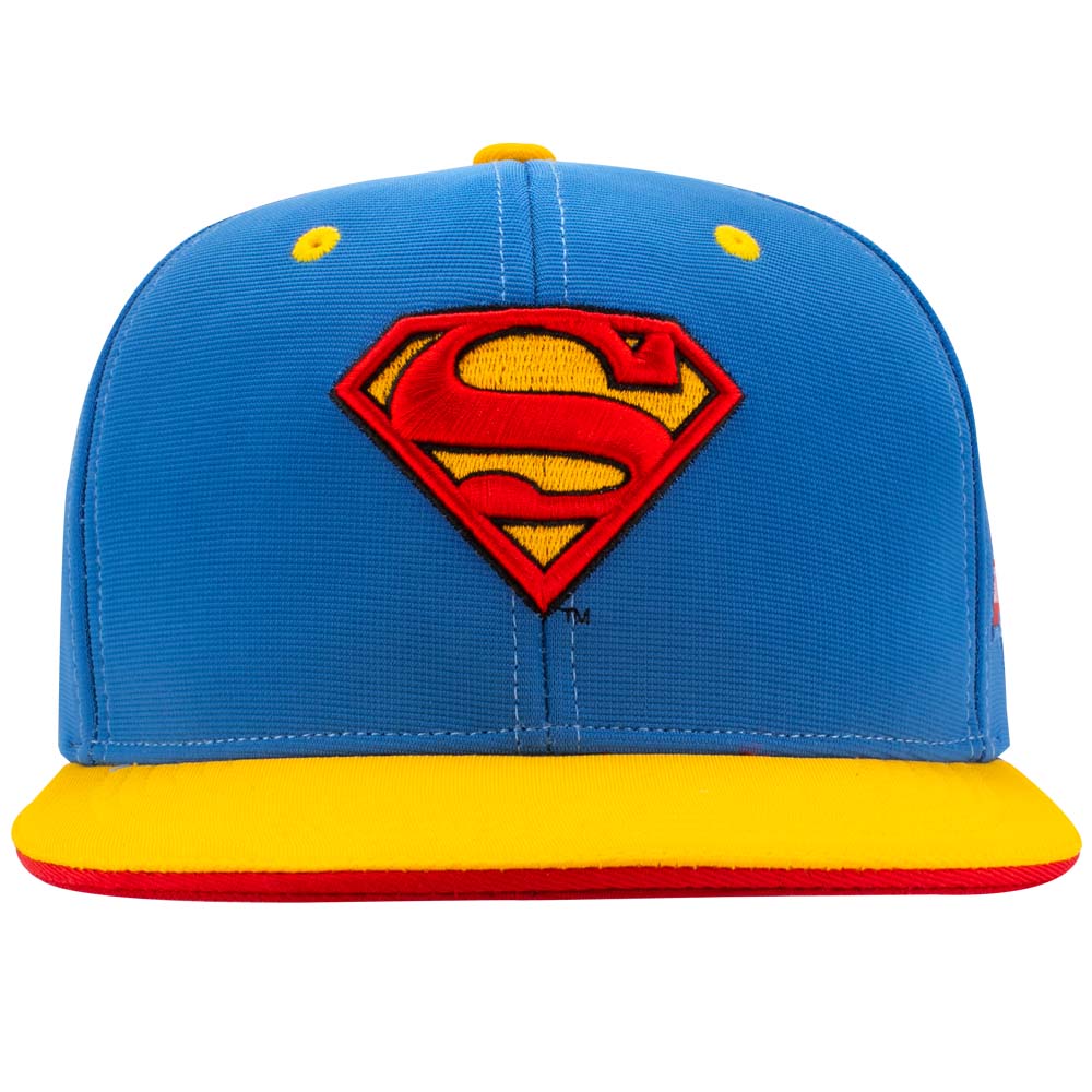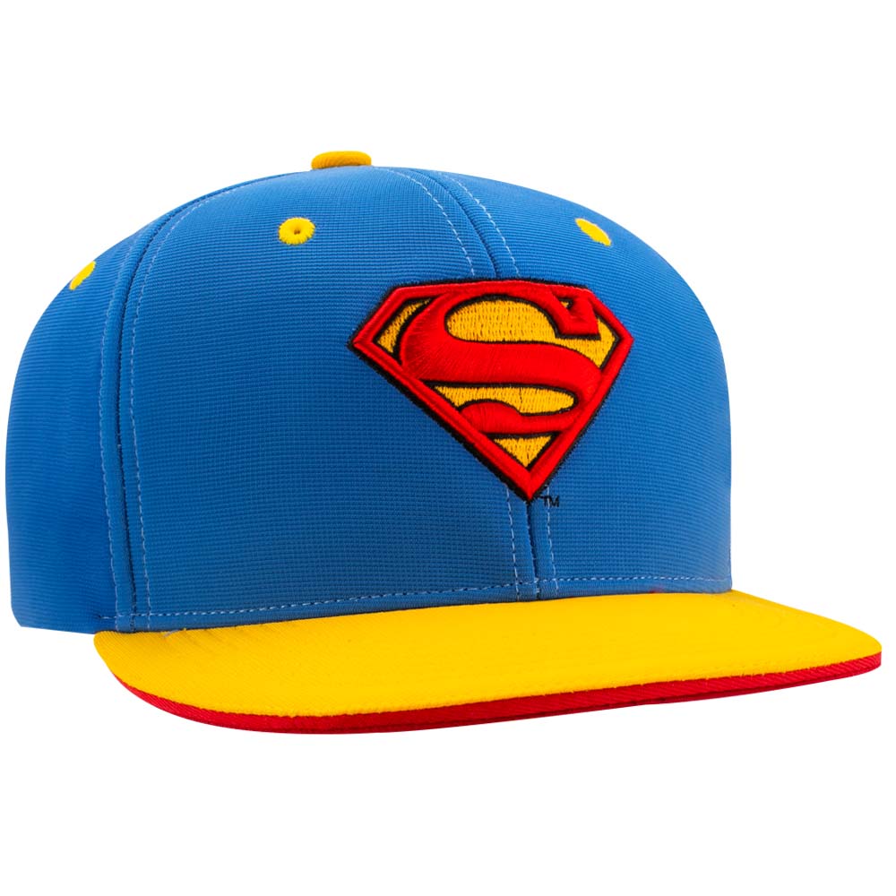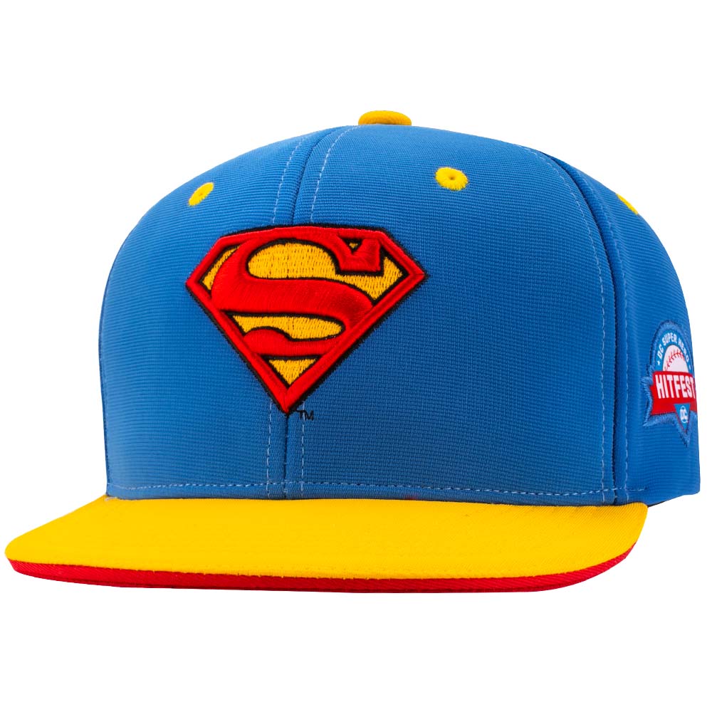 Stretch-Fit cap with flat visor and blue crown / yellow visor. Raised front embroidered Superman logo. Stretch Fit fits most head sizes. Available in Adult size.